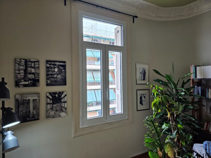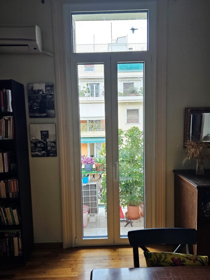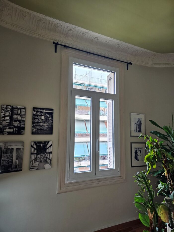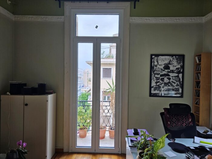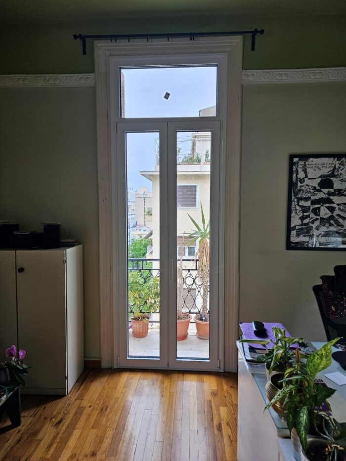 Αντικατάσταση παλαιών κουφωμάτων με νέα ενεργειακά παράθυρα και μπαλκονόπορτες στο Κέντρο Αθήνας κουφώματα αλουμινίου χρώμα Ammos Ral 9010. Τα κουφώματα αλουμίνιου στου Κέντρο Αθήνας κουφώματα αλουμινίου είναι κατασκευασμένα με την ενεργειακή θερμοδιακοπτόμενη σειρά της Europa Eos 60 Hybrid. Όλά τα αλουμίνια στο κέντρο της Αθήνας έχουν Ηχοακουστικούς – ηχοαπορροφήτικους υαλοπίνακες με δυνατότητα ηχομείωσης της τάξεως των 41 db (desibell).